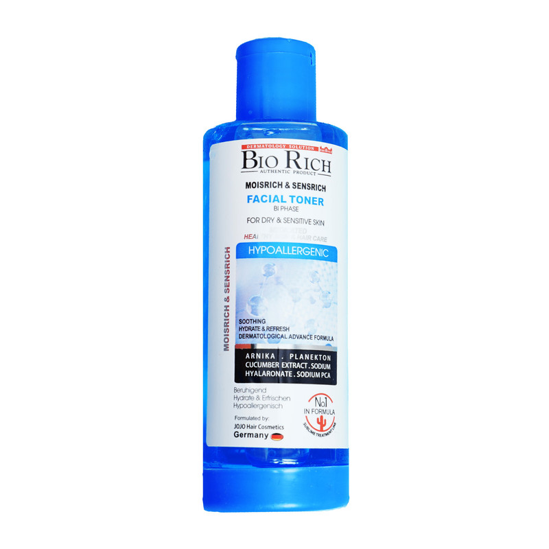پاکسازی و شستوشوی مناسب صورت یکی از اساسی ترین مراحل مراقبت و سلامت پوست است. آب به تنهایی قادر به پاک کردن همه آلودگی ها نیست و به مکملی دیگری نیاز دارد. تونر دو فاز پوست بایوریچ بر پایه فاز پاک کننده و فاز ترمیم کننده سیلیکونی می باشد که با چربی کاملا کنترل شده در هنگام زدودن آلودگی ها، خشکی های سطحی پوست را ترمیم می نماید. وجود عصاره گیاه عشقه ،عصاره پلانکتون ،عصاره خیار و سدیم هیالورونات،عصاره گل تنباکوی کوهی و دی پنتنول در این محصول هیدراسیون پوست را بالا برده، الاستیسیته پوست را افزایش بخشیده، تاثیر بسیار مناسبی بر روی کاهش التهاب و خارش پوست گذاشته و سوخت و ساز سلولی را کنترل می نماید.