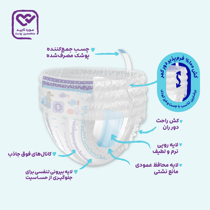 پوشک شورتی کانالدار مایبیبی با کش 100 درصد فرمپذیر دور کمر با اضافه شدن انحنای S مانند، جست و خیز راحت را برای کودک فراهم کرده و با لایه رویی به نرمی پنبه، از پوست حساس او، محافظت میکند. این محصول نوآورانه، به تایید متخصصین پوست رسیده و با تعویض آسان و سریع، تجربه شیرینی برای کودکان و والدین به همراه دارد.